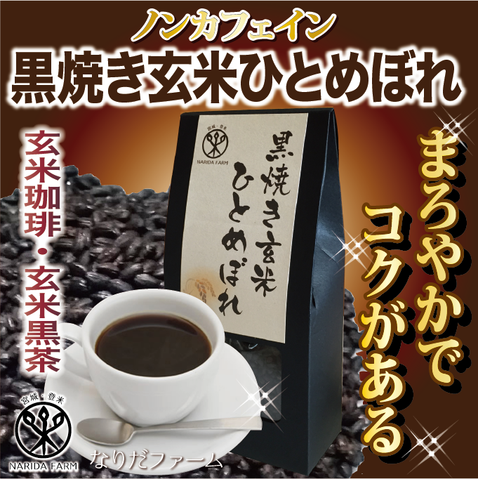 もちもちの粘りとほどよい甘味が特徴の登米市産”ひとめぼれ”。長時間煎って黒焼きにしたひとめぼれ玄米は、香ばしい香りとコク、スッキリした飲み口の玄米珈琲、玄米黒茶としてお召し上がりいただけます。飲み方レシピ付き。