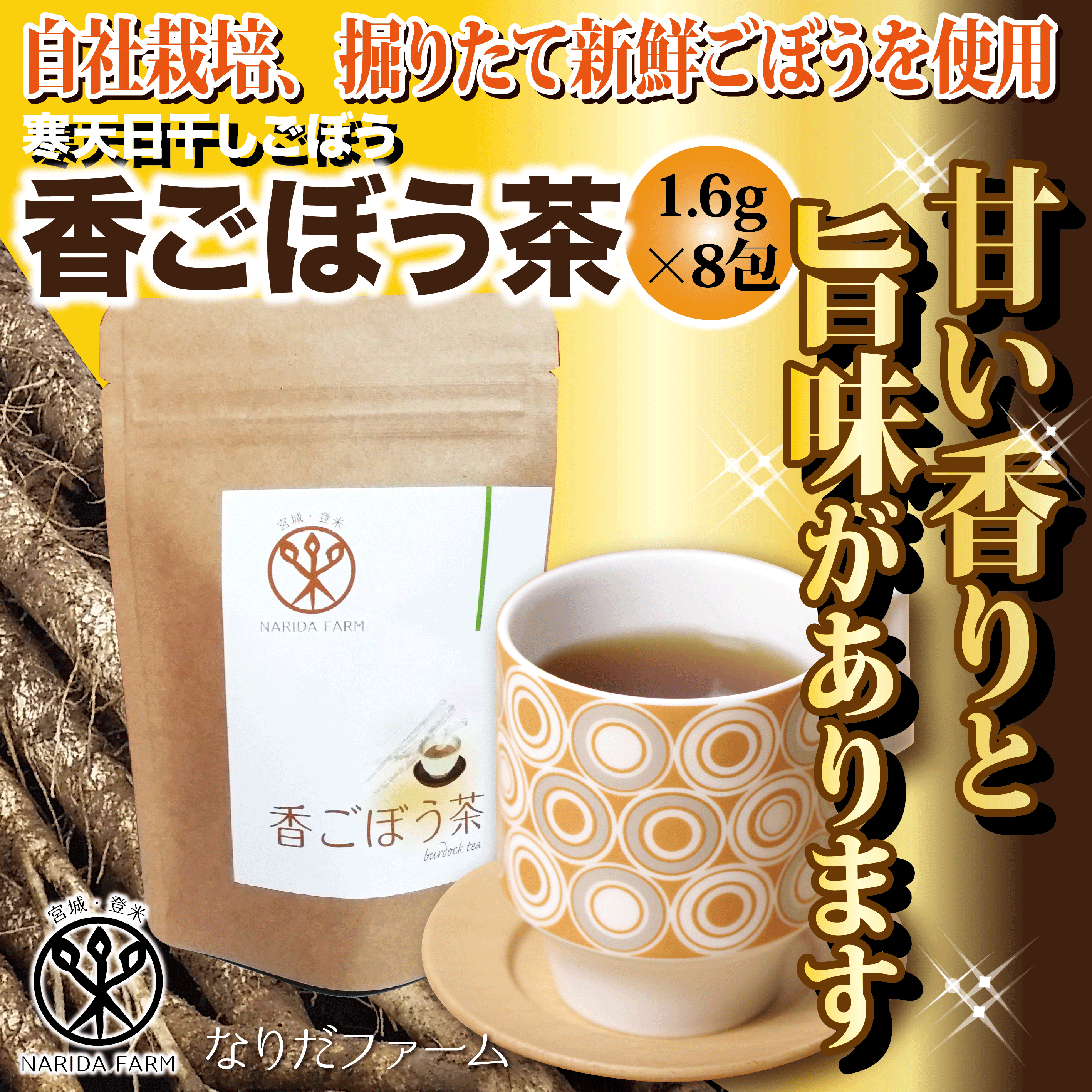 こだわりの自社産ごぼうを原料とした手造りごぼう茶です。掘りたての新鮮なごぼうを丁寧に水洗いし、皮ごとスライスしたごぼうを天日干し乾燥・寒ざらしで香りと旨味が凝縮されたごぼうに作り上げました。香り、旨味を引き出す独自製法で作られた「香ごぼう茶」。数量限定品です。みやぎの環境にやさしい農産物認証ごぼう。