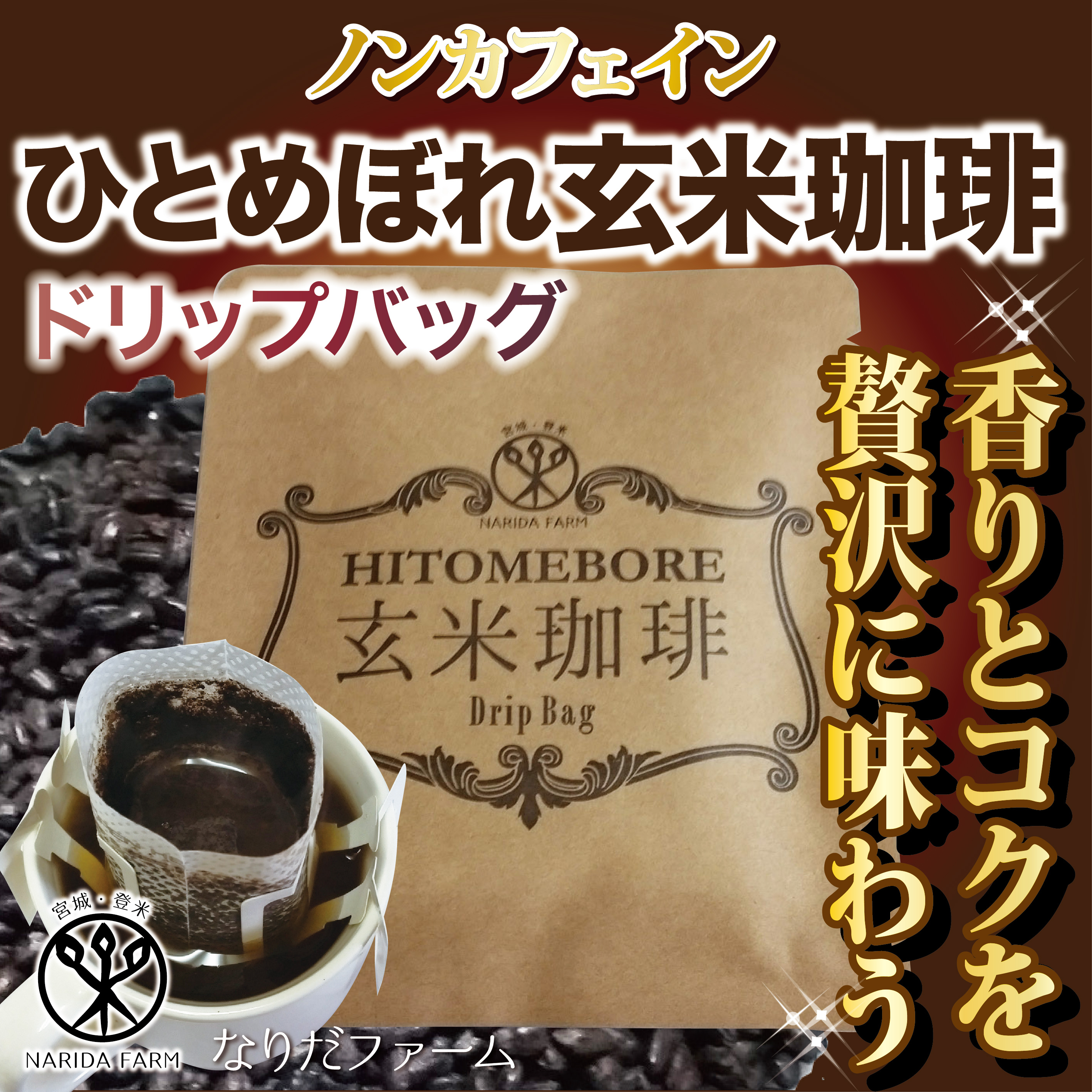 からだいたわる農産飲料、玄米珈琲のドリップ式。挽きたての風味とコクを味わう1杯に、たっぷり20ℊ使用。ノンカフェインで、より珈琲が感じられるビターティスト。宮城県登米市産ひとめぼれ玄米使用。